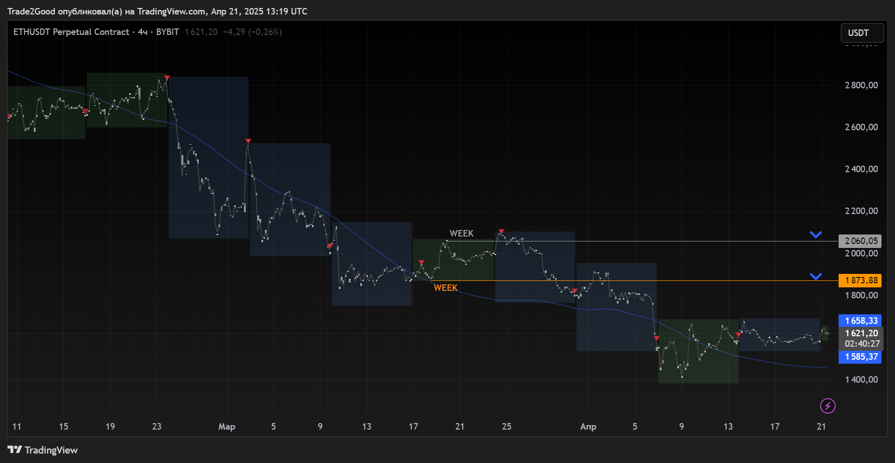 На фоне плавного тренда на продажу Эфир не спешит делать резких движений, оставаясь в рамках предыдущей недели. Ждем новых уровней и уверенного движения цены, а пока оставляем те же уровни, что и в прошлые недели.