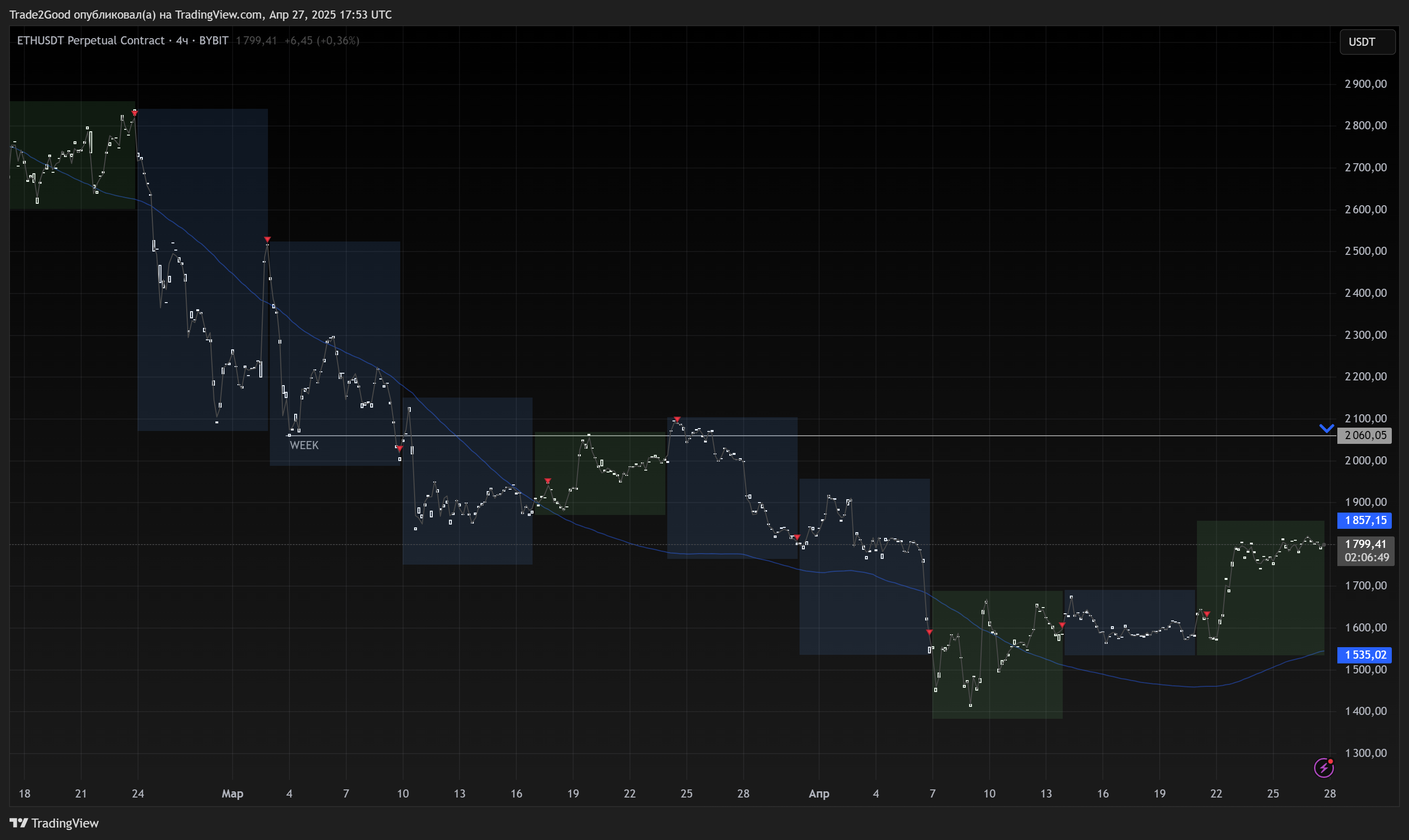 После небольшой проторговки на прошлой неделе Эфир решил продолжить свой рост. Тем не менее, сильные знаки на разворот тренда нет, поэтому мы оставляем уровень прошлой недели и торгуем на продажу. Следим за движением цены и готовимся к потенциальному рывку.