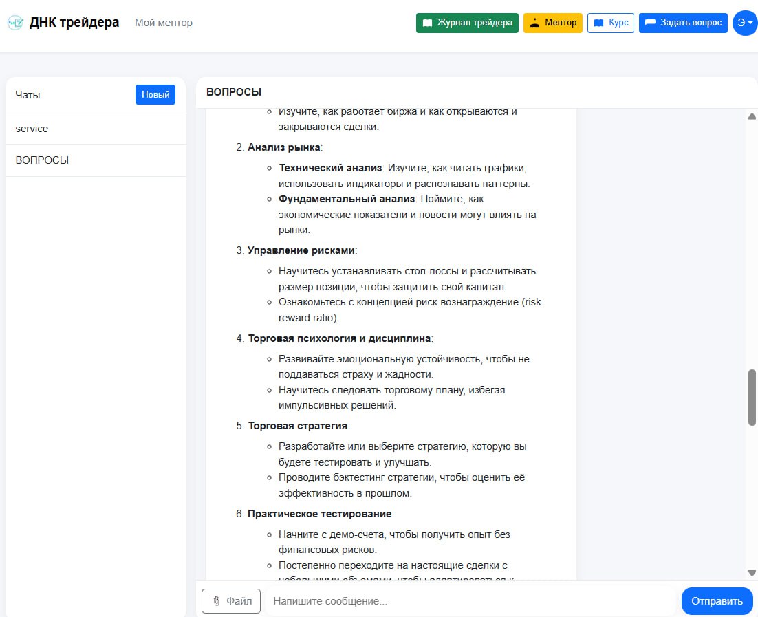 На сегодняшний день ДНК трейдера — это удобный, эффективный рабочий инструмент для каждого, кто серьезно относится к трейдингу. Особенно ценно, что продукт дорабатывается в режиме реального времени: прислушиваются к обратной связи, готовы помогать и решать возникшие вопросы. Уверена, с такими темпами развития ДНК трейдера станет надежным союзником и персональным помощником в торговле — не просто сервисом, а частью каждого успешного трейдера.