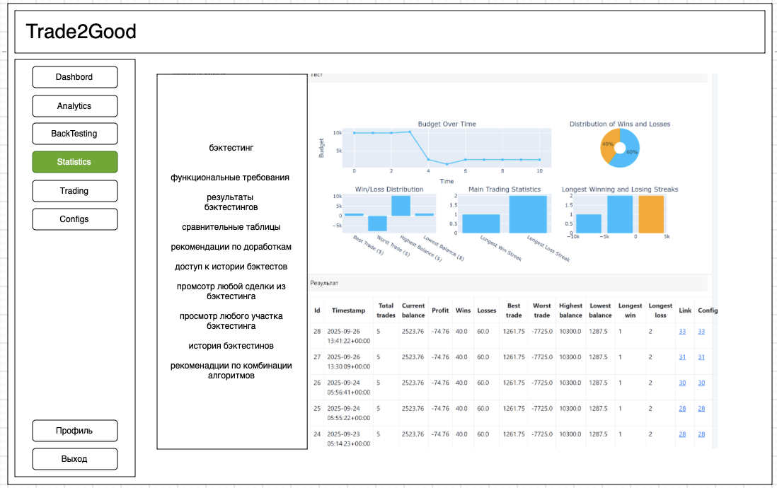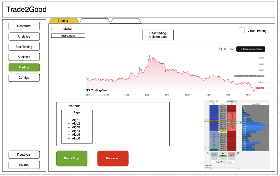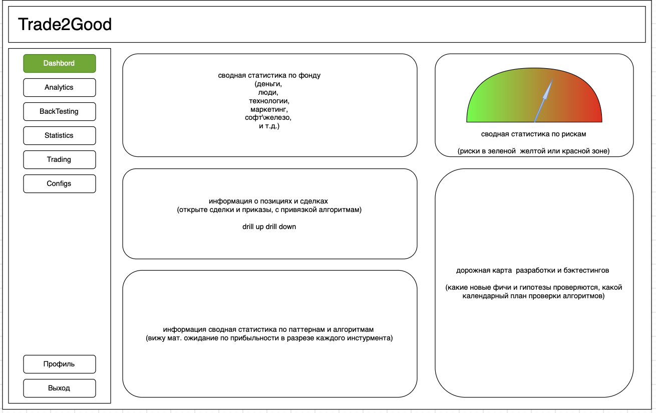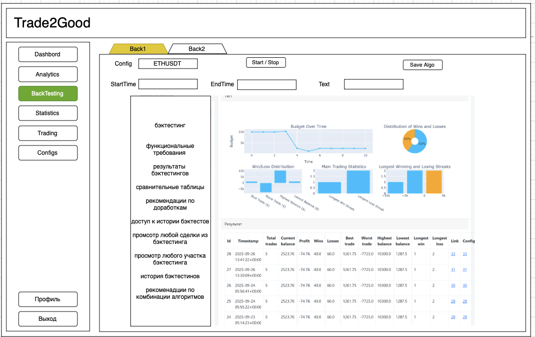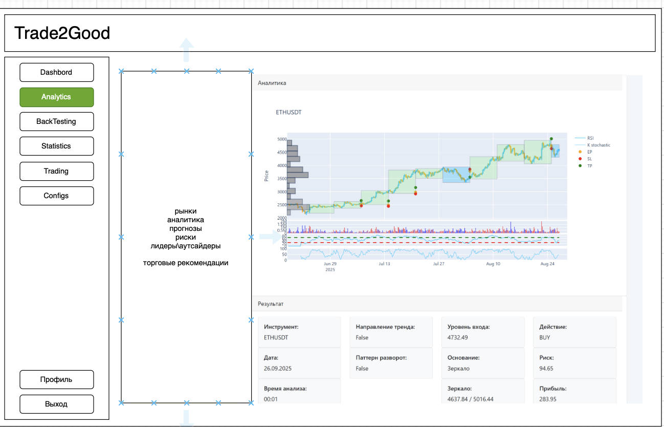 Если опираться только на ручные расчеты, это превращается в хаос. Команде аналитиков нужна среда, где можно выстраивать и проверять торговые гипотезы, видеть результаты тестов, управлять рисками и контролировать капитал в едином интерфейсе. Так родилась идея собственного фреймворка Trade2Good — внутренней операционной платформы, которая объединяет все звенья работы с алгоритмами: от аналитики данных до реальных торговых операций. По сути, это внутренняя экосистема фонда, где стратегии рождаются, проверяются и только после этого допускаются к управлению деньгами.