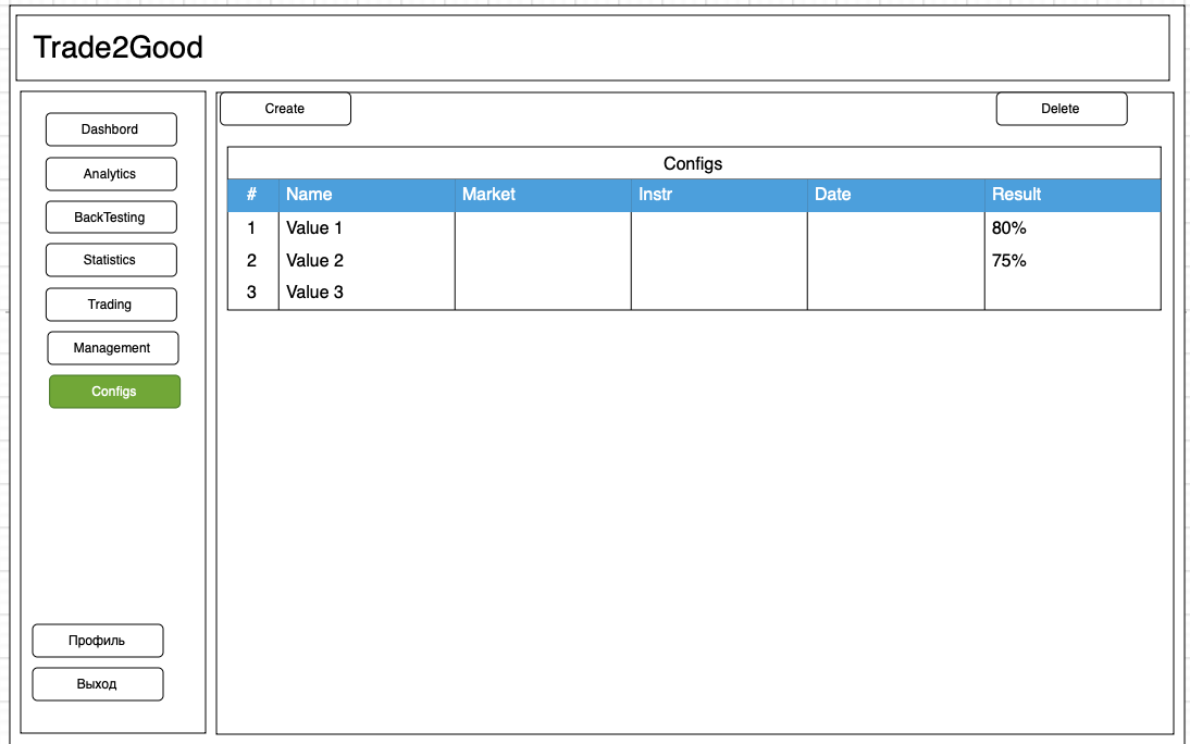 Конфигурации. Это набор параметров, описывающих стратегию: рынок, инструмент, индикаторы, объемы сделок, рисковые лимиты, визуализацию на дашборде.