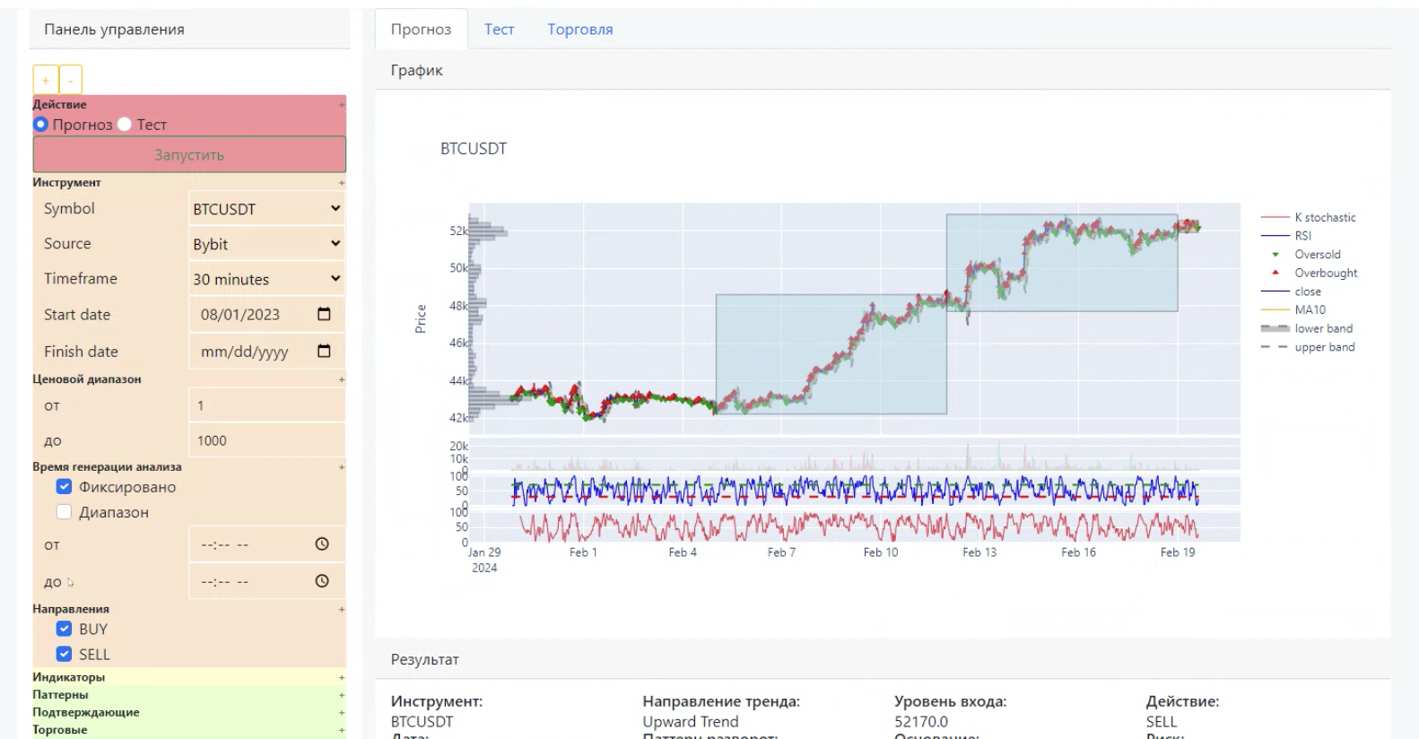 Аналитика. Это основное рабочее место аналитика. На экране — графики с подсветкой индикаторов, динамика цен, сигналы. Здесь формулируются гипотезы, которые позже будут протестированы.