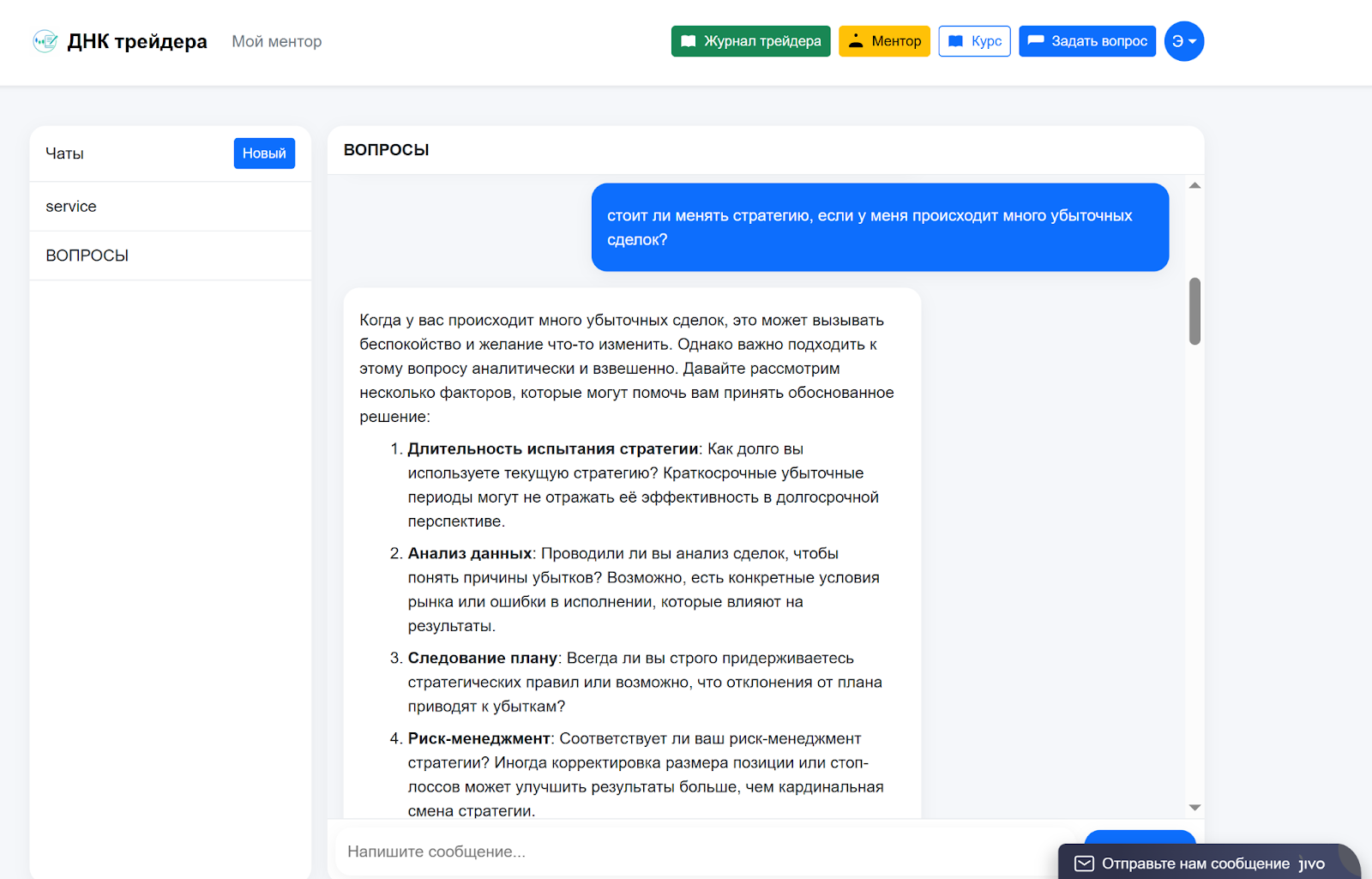 Конечно, у меня есть люди, к которым я могу обратиться за советом, но они не всегда доступны. В этом плане Ментор незаменим — он всегда «ждет» в ДНК трейдера. Я задавала ему конкретные вопросы, просила проанализировать журнал и отдельные сделки.