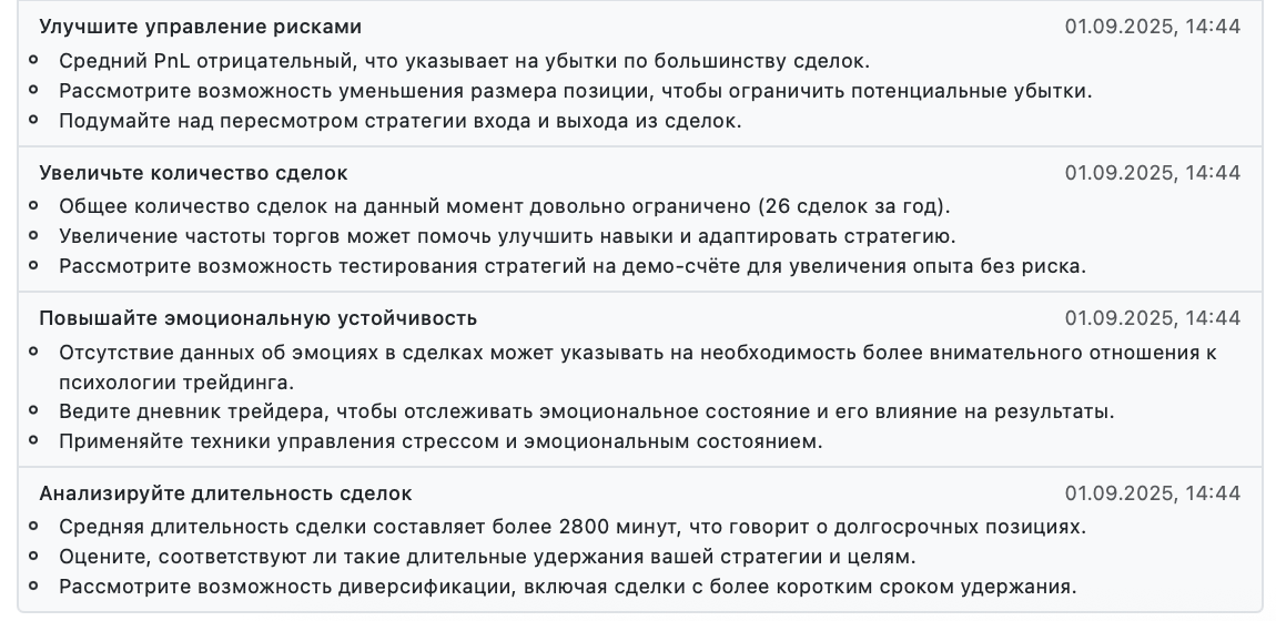 Для начинающих трейдеров это идеальный старт: все понятно, есть ИИ-наставник, который объяснит ошибки. Для опытных — это инструмент углубленной аналитики: можно увидеть закономерности, которые самому сложно заметить.