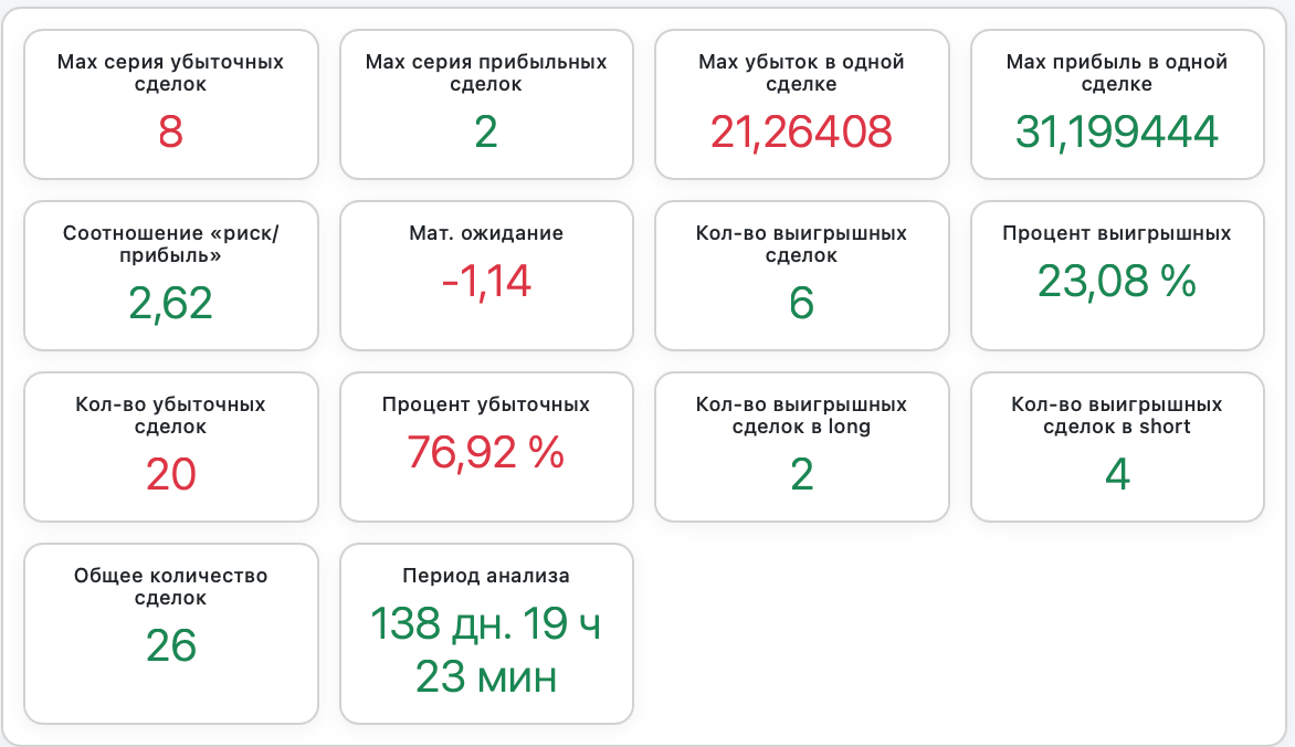 В итоге оказалось, что серьезных ошибок почти не было: система работала правильно, просто рынок находился в неудачной фазе, где большинство входов ломалось по стопам. Этот вывод очень важен — он помог мне не паниковать, не менять стратегию на эмоциях и продолжать работать по плану.