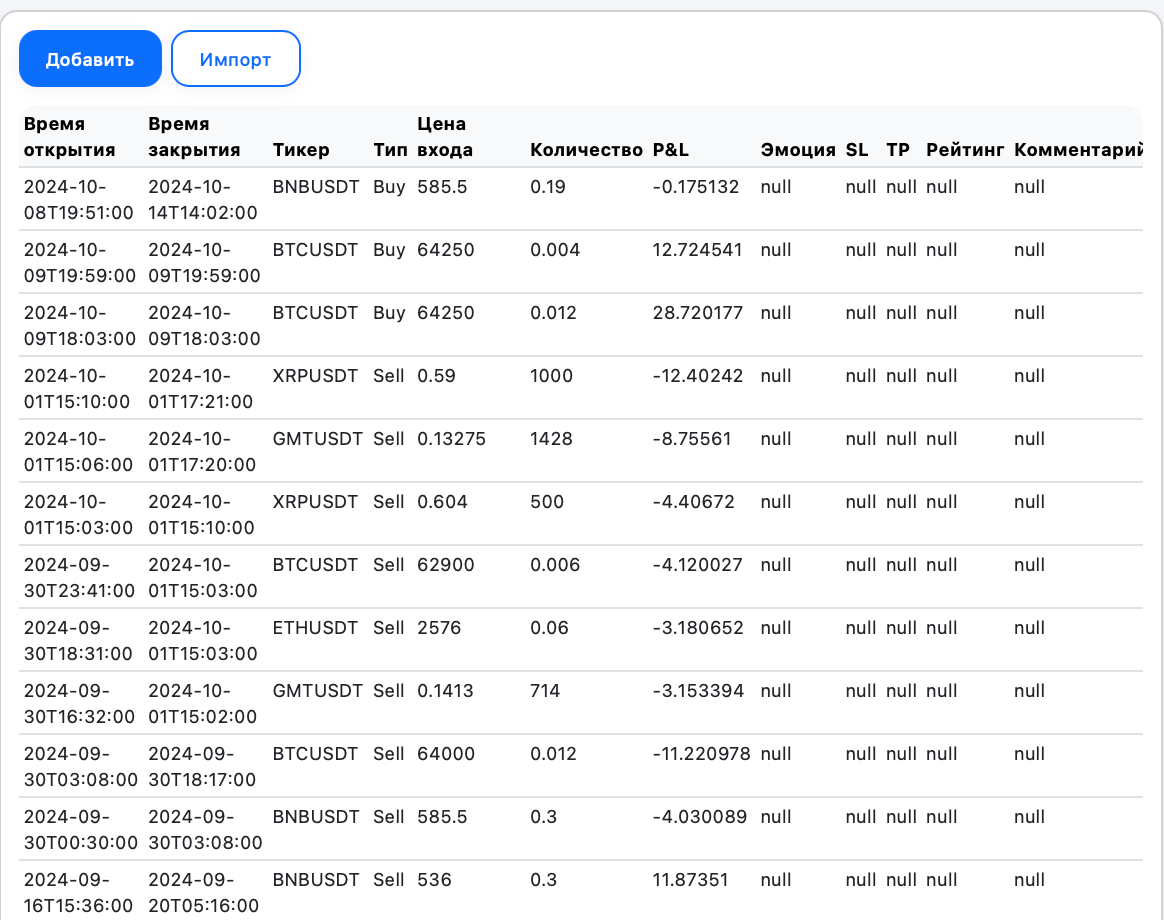 Это классический журнал торговли для структурирования ордеров и сделок — база, без которой я уже не представляю свою работу. В журнал можно подтягивать сделки прямо из Bybit или другой биржи — это экономит массу времени. Но если нужно, можно добавить сделки вручную.