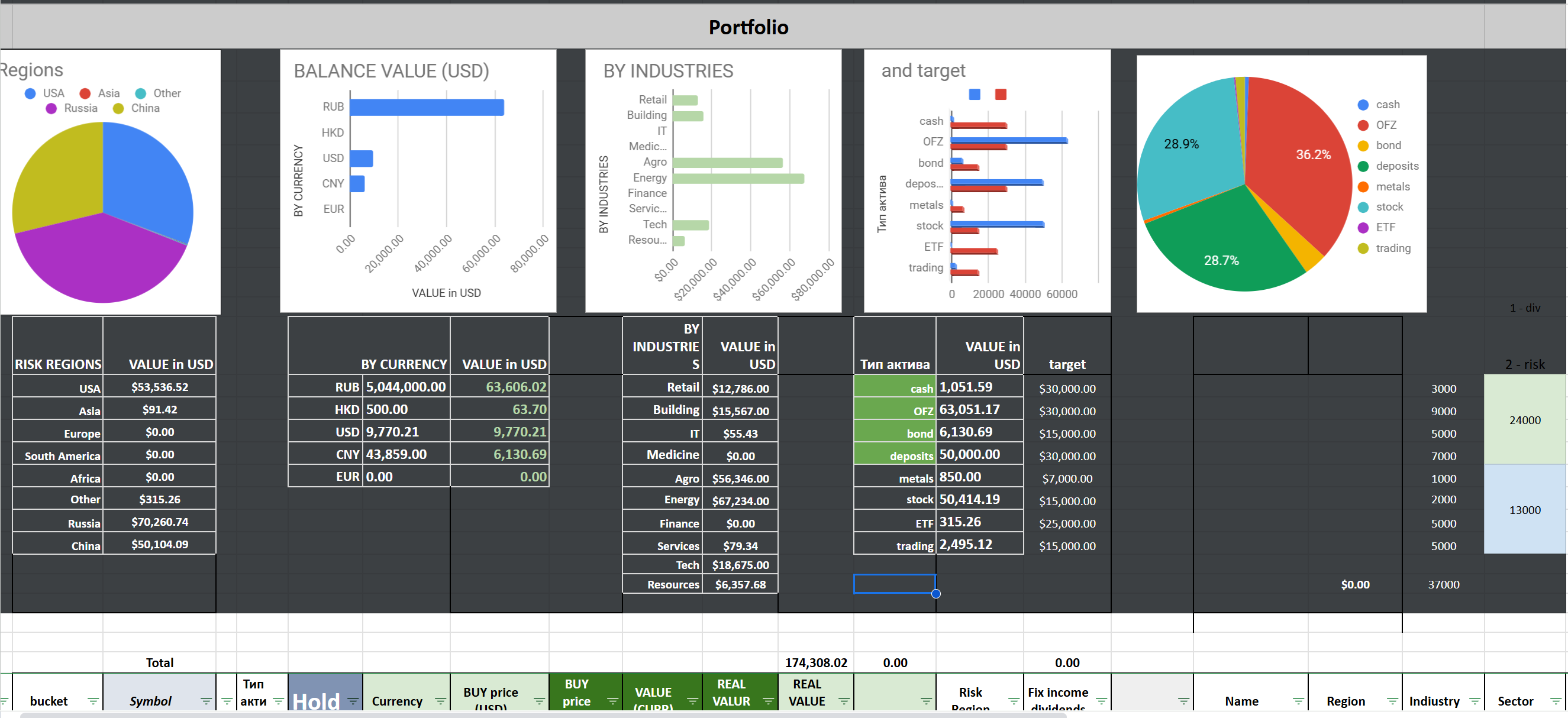 • Портфельная таблица. Видно все: доли активов, текущие позиции, статистика по доходности, коррекции и ребалансировки.