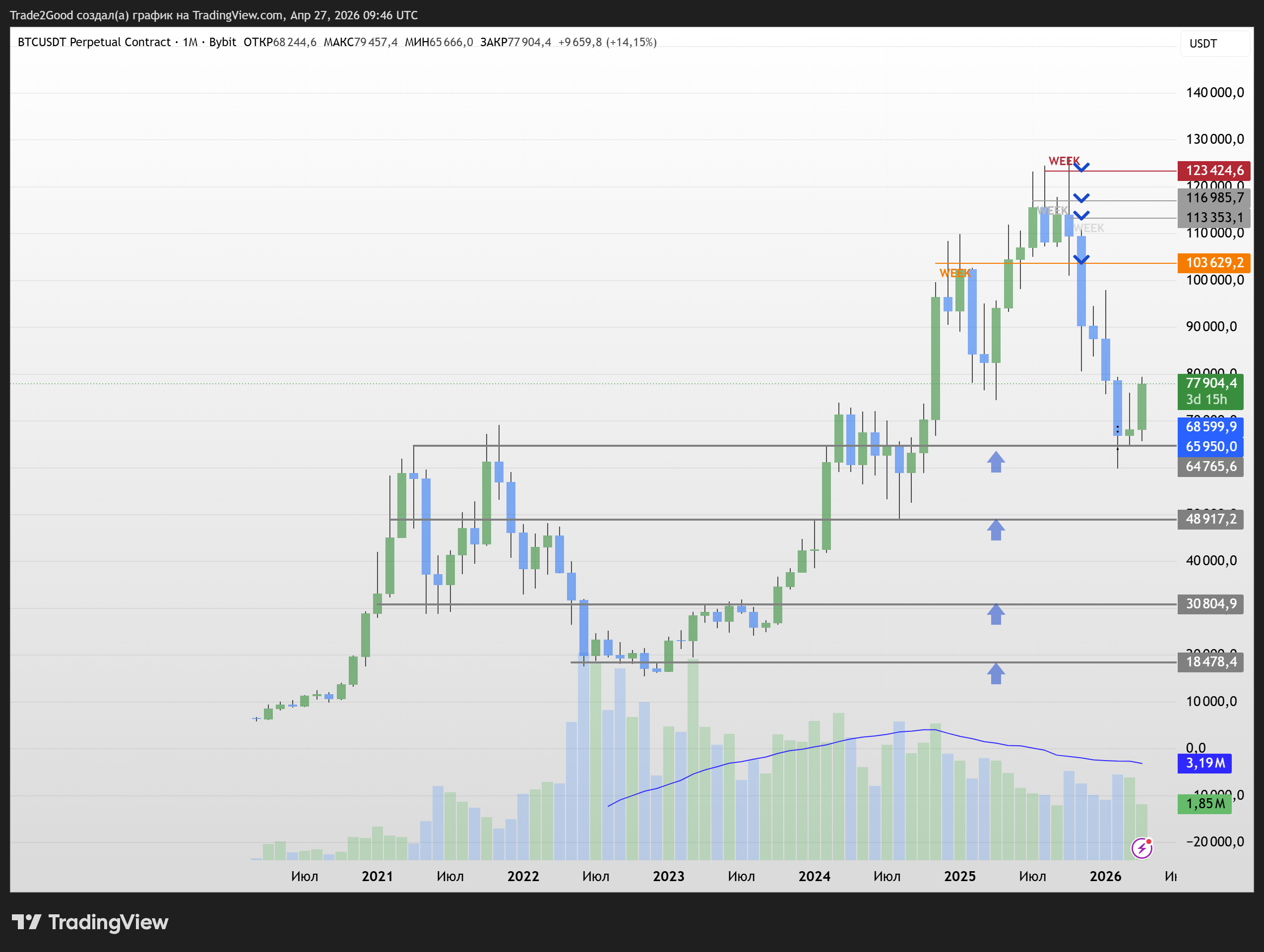 Комментарий CTO Trade2Good: сейчас биткоин находится в стадии коррекции. Мы уже достигли первых целевых уровней, от которых возможен локальный рост. Но нельзя исключать дальнейшее снижение — у рынка остаются цели ниже текущих значений.