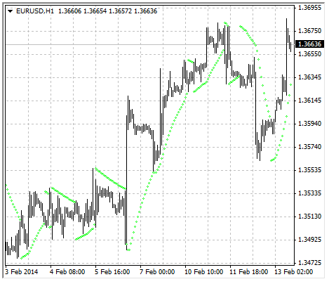 - Parabolic SAR — показывает потенциальные точки разворота тренда. Располагается над/под ценой: если точки сменили сторону — вероятен разворот.