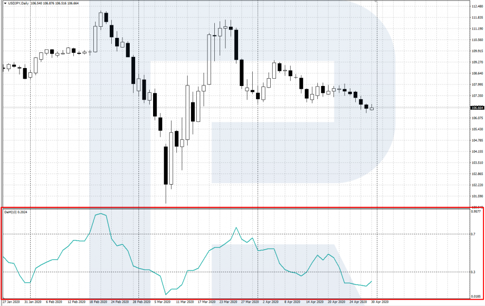 - DeMarker — измеряет спрос на актив, сравнивая максимумы текущих и предыдущих свечей; показывает усталость тренда и возможный разворот