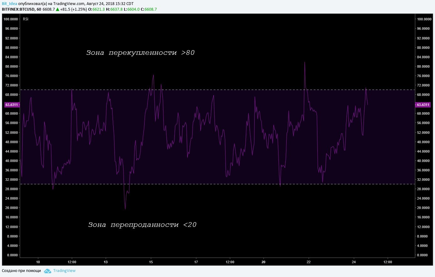 - RSI (индекс относительной силы) — показывает силу текущего движения и помогает выявить перекупленность или перепроданность — сигналы на разворот