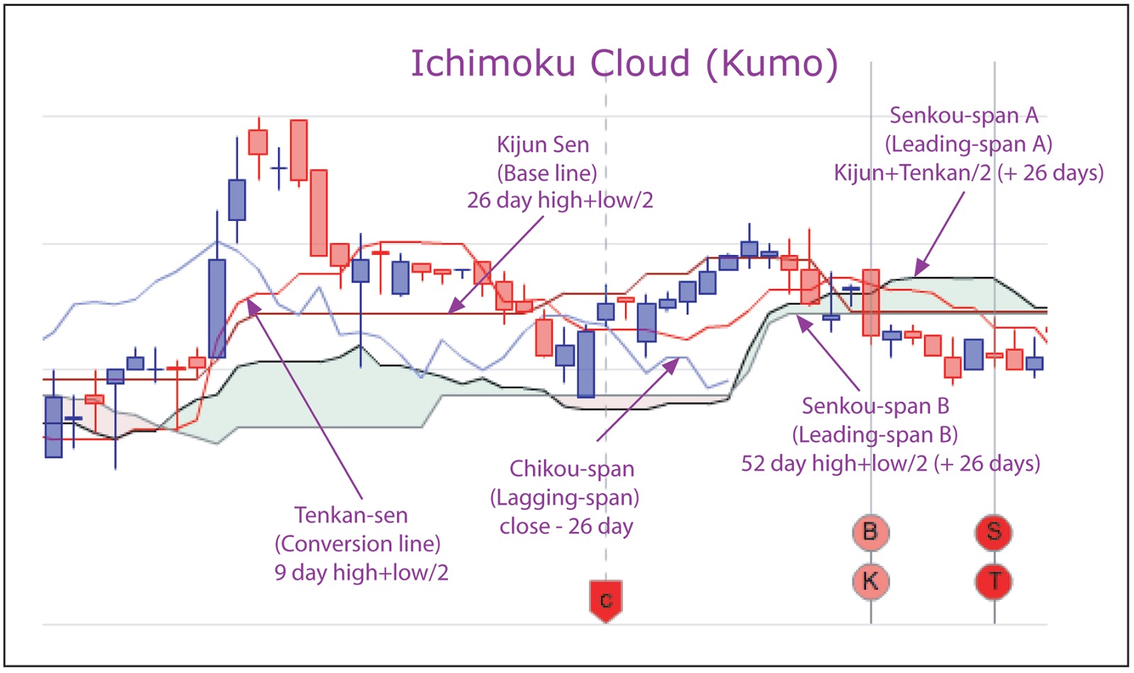- Ichimoku Cloud — комплексный индикатор: показывает тренд, уровни поддержки/сопротивления и возможные сигналы на вход/выход