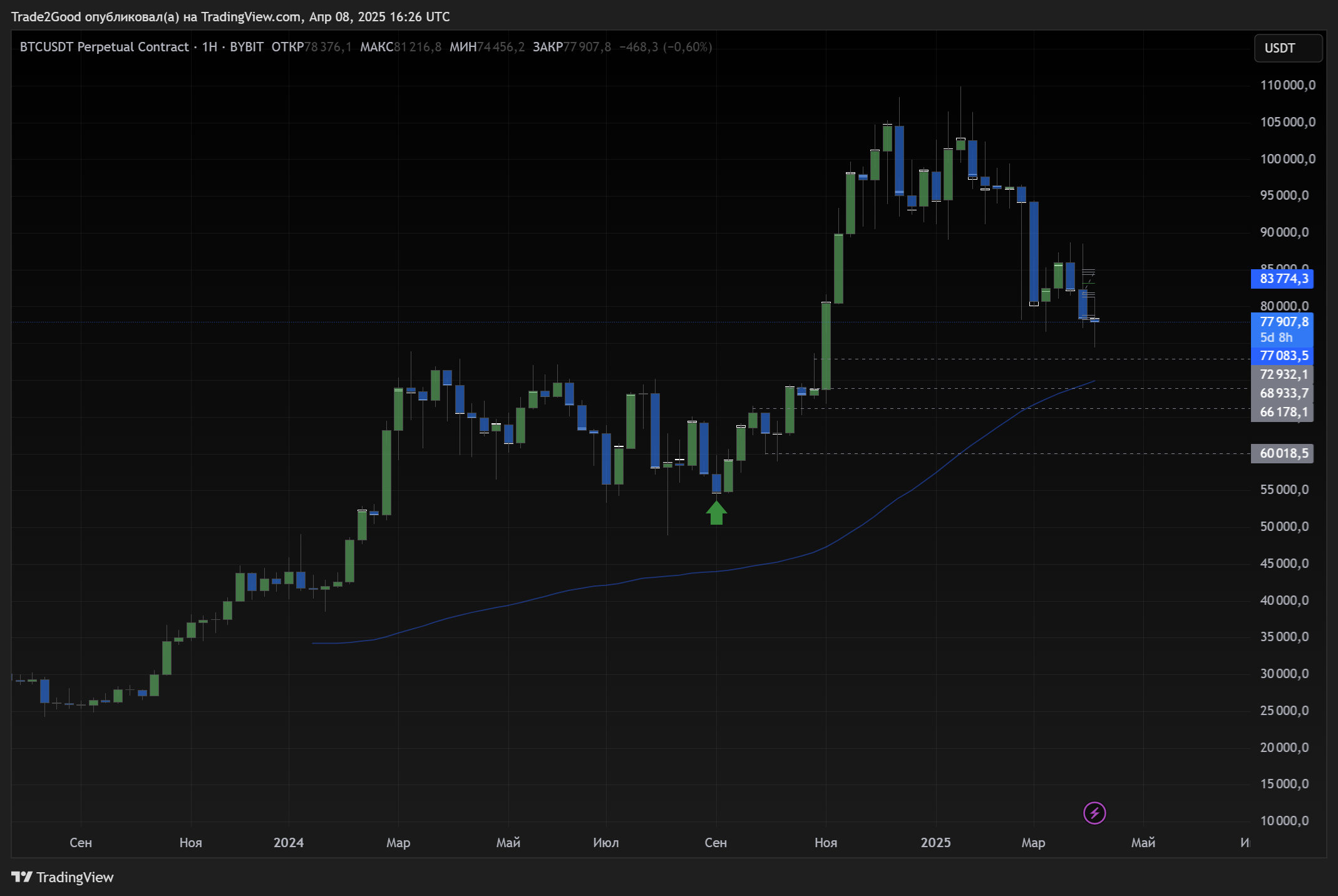 Биткоин (#BTCUSDT) коснулся уровня $76 500 и устремился вниз. Следующая остановка — $70 000. Для тех, кто верит в светлое криптобудущее, это может быть отличной возможностью докупить по скидке. Но помните: крипта — это американские горки для вашего депозита.